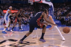 GIF-哈登持球被大瓦格纳干扰出界,裁判吹魔术球权,骑士挑战成功,拿回球权