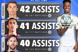 体育资讯04月16日讯 欧冠1/4决赛次回合,皇马3-4总比分4-6不敌拜仁被淘汰,维尼修斯助攻姆巴佩破门,据统计这是维尼修斯在欧冠的第31次助攻,升至历史第5。
